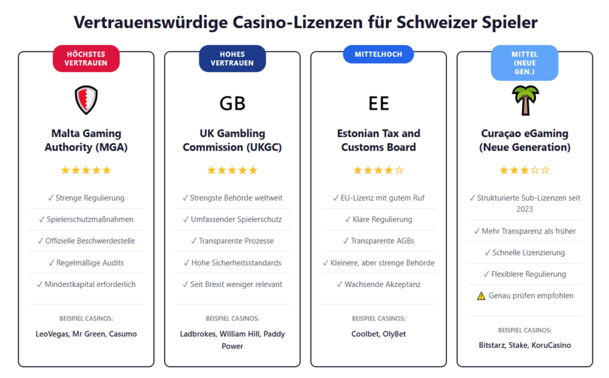 | Lizenzgeber | ESBK (Eidgenössische Spielbankenkommission) | MGA, Curaçao, UKGC, Estonian Tax Board |