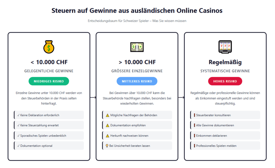 Gelegentliche Gewinne unter 10.000 Franken werden selten hinterfragt. Regelmäßige oder sehr hohe Beträge können jedoch als Einkommen eingestuft werden, besonders bei systematischem Spielen. Profispieler oder Streamer sollten Gewinne dokumentieren und mit einem Steuerberater sprechen.